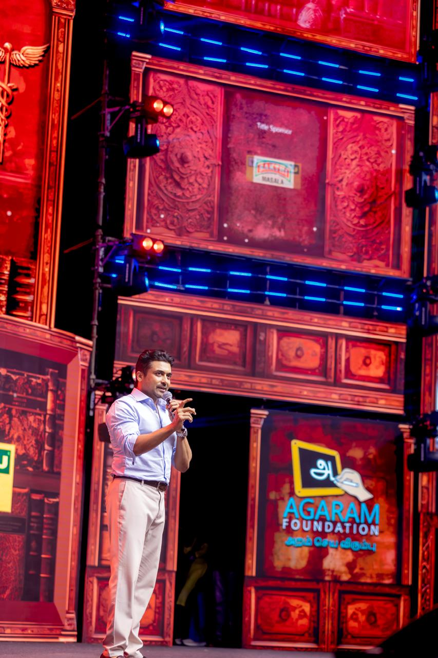 சூர்யாவின் ‘அகரம் பவுண்டேஷன்’ 20வது ஆண்டிலும், அதன் விதைத் திட்டம் 15வது ஆண்டிலும் அடியெடுத்து வைக்கிறது. இதனை முன்னிட்டு சென்னையில் பிரமாண்ட விழா நடந்தது. இந்த விழாவில் நடிகர் சூர்யா, மனைவி ஜோதிகா, தந்தை சிவக்குமார், தம்பி கார்த்திக், நடிகர் கமல்ஹாசன், இயக்குநர் வெற்றி மாறன், இயக்குநர் ஞானவேல் உள்பட பலர் பங்கேற்றனர். இந்த நிகழ்ச்சியில் நடிகர் சூர்யா பேசுகையில், கல்வியே ஆயுதம்.. இதுதான் அகரத்தின் நம்பிக்கை. அந்த நம்பிக்கை நனவாகி இருக்கிறது. கல்வி என்பது படிப்பு மட்டுமல்லாமல் பண்பைச் சொல்லிக் கொடுப்பதும், அவர்களின் திறமைகளை வெளிப்படுத்துவதும் தான். அதனை இன்று மடங்கு மாணவர்கள், மாணவிகள் வெளிக் கொண்டு வந்திருக்கிறார்கள் என்றார்.