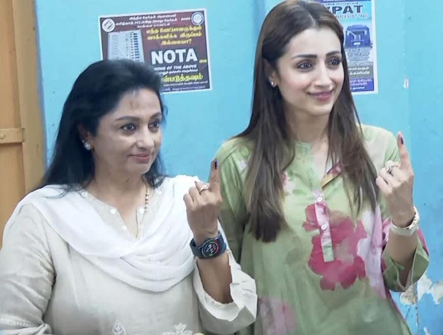 நடிகை திரிஷா அம்மாவுடன் வந்து வாக்களித்தார்.