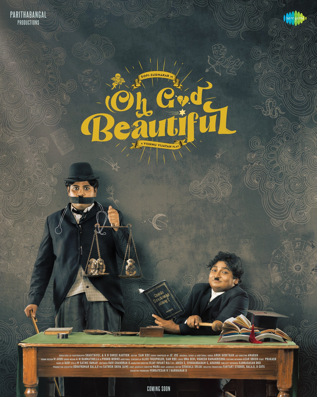 புதுமுக இயக்குநர் விஷ்ணு விஜயன் இயக்கத்தில், பரிதாபங்கள் கோபி, சுதாகர் முதன்மை பாத்திரங்களில் நடித்துள்ள படம் “ஓ காட் பியூட்டிஃபுல்”.பேண்டஸி, பேமிலி எண்டர்டெயினர் ஜானரில், எமோஷனல் டிராமாவாக உருவாகியிருக்கும் இந்த படத்தை பரிதாபங்கள் புரடக்சன்ஸ் தயாரித்துள்ளது. இந்தப் படத்தின் ஃபர்ஸ்ட் லுக் நேற்று வெளியானது. அதில் சார்லி சாப்ளின் மேக்கப்பில் கோபி அமர்ந்திருக்க, அருகே வாய் கட்டப்பட்ட நிலையில் இன்னொரு சார்லி சாப்ளினாக நியாய தராசு ஏந்தி நிற்கிறார் சுதாகர். தராசில் ஒரு புறம் காந்தியின் புகழ் பெற்ற மேற்கோளை பிரதிபலிக்கும், கண்களை மூடிய குரங்கு பொம்மையும், காதை மூடிய குரங்கு பொம்மையும் இருக்க, இன்னொரு புறம் வாயை மூடிய குரங்கு உள்ளது. கோபியின் கையில், அரிச்சந்திரன் எழுதிய பொய் சொல்வது எப்படி என்கிற புத்தகம் உள்ளது. இந்த ஃபர்ஸ்ட் லுக் ரசிகர்களிடமும் பெரும் பாராட்டுக்களைக் குவித்து வருகிறது.